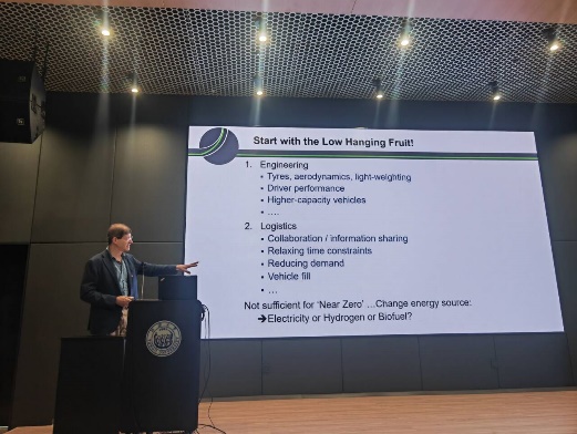 First, Prof. David Cebon opened his speech by clarifying the industry positioning of long-haul road freight——as a core link in the global economic supply chain, it accounts for a significant proportion of energy consumption and carbon emissions. However, due to constraints from technical characteristics and operational scenarios, it has become a key sector that is “difficult to decarbonise” in the field of transportation. He further analyzed the technical pain points: heavy-duty trucks need to continuously output high power to ensure long-haul transportation efficiency, while the current mainstream battery electric technology has bottlenecks in driving range, fast energy replenishment capability, and load adaptability, making it difficult to meet the actual needs of long-haul freight. Thus, there is an urgent need to explore more suitable decarbonisation pathways.