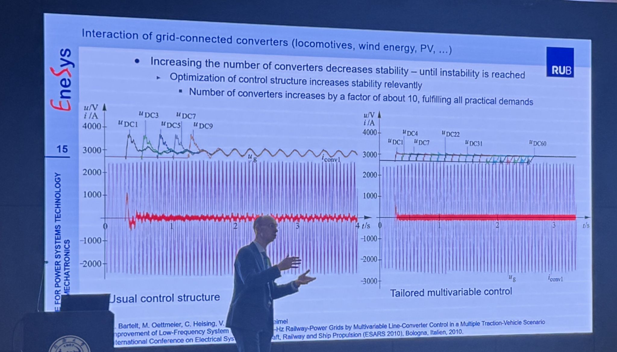 The presentation explored key aspects of physics-driven modeling and control, using practical, railway-oriented examples to illustrate challenges and solution strategies. Each example was paired with adapted control techniques and refined modeling approaches that address non-ideal effects in real-world systems. While most cases were railway-focused, the underlying principles are broadly applicable — particularly to converter control in renewable energy systems, such as wind and photovoltaic power generation. Among the highlights were energy-aware induction generator control, which enhances DC-link voltage stabilization, as well as sensorless control across the entire speed range and grid-friendly converter operation. These developments underscore EneSys’s pivotal role in bridging theory and practical application in modern energy system control, contributing to a more efficient and sustainable future.